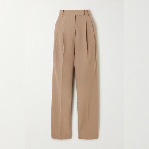 Elevate your office or casual wardrobe with these tailored high-waist trousers. Featuring sharp pleats, a flat front, and a relaxed wide-leg fit in a soft beige hue. Perfect for pairing with blouses or structured tops.