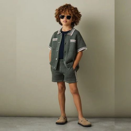 A stylish button-down polo and shorts coord set in olive green with white stripe detailing. Made from textured fabric for a sporty vintage appeal, perfect for dressy-casual occasions.